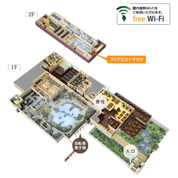 熱気で一気に汗を噴き出させたい方も、体への負担少なく、じっくりと芯から温めたい方も、お好みにあわせてご利用いただけます。また、「水風呂」も深さの異なる2つの浴槽をご用意しております。